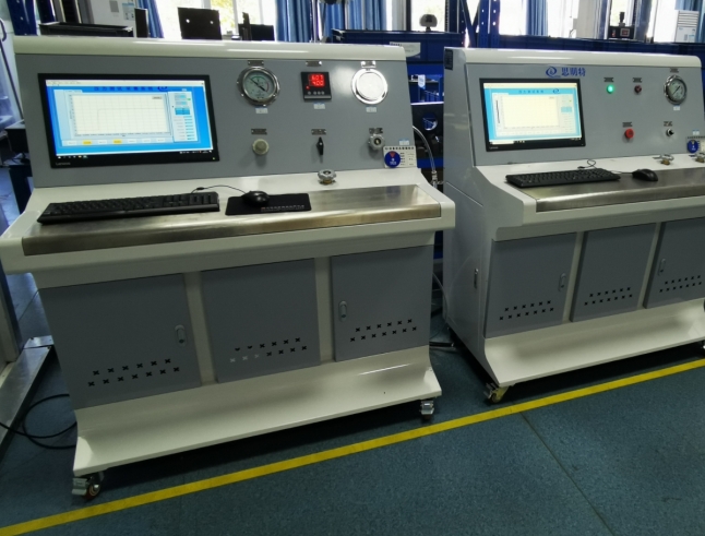 ? 水壓強度試驗機—液壓強度測試臺可分為: 手動按鈕設備、半自動設備、計算機設備三種配置。主要是根據客戶工況要求以及其他要求選型,檢測目的是測試產品的工藝檢測流程、常見的有管線、閥門、容器、換熱器或檢修期間因改動而焊接過的工藝管道和設備,以確保各接頭或焊縫強度,使裝置能安全承受正常的操作壓力。基本原理為:利用現場的低壓氣源,通過思明特氣動泵完成對高壓的輸出,再由思明特控制系統完成對壓力的控制和數據的采集,從而完成對整個水壓強度測試的過程。采用計算機控制試驗過程,利用思明特編程軟件,最終實現水壓強度檢測的自動化控制,能夠顯示試驗時間、試驗壓力和試驗次數等值,采集水壓/液壓試驗曲線,試驗結果可自動保存,可打印輸出.測試步驟:對測試件進行注液、排氣、密封、增壓、到達壓力后停機,進入保壓計時狀態,完成對被測件的水壓強度測試。一般為工作壓力的1.5倍。
